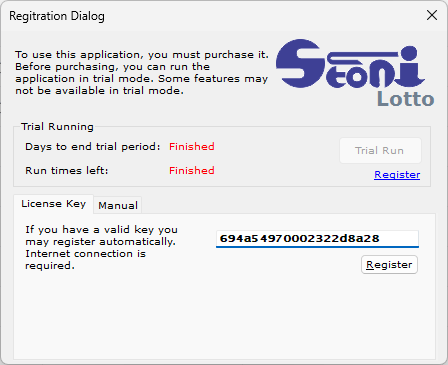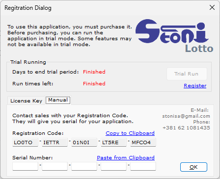 There is also a manual registration option available. In this case, you will need to send me your serial number, and I will provide you with the corresponding registration key. To avoid any typos, please use the "copy to clipboard" function when sending the code, as it ensures the key is copied without hyphens.